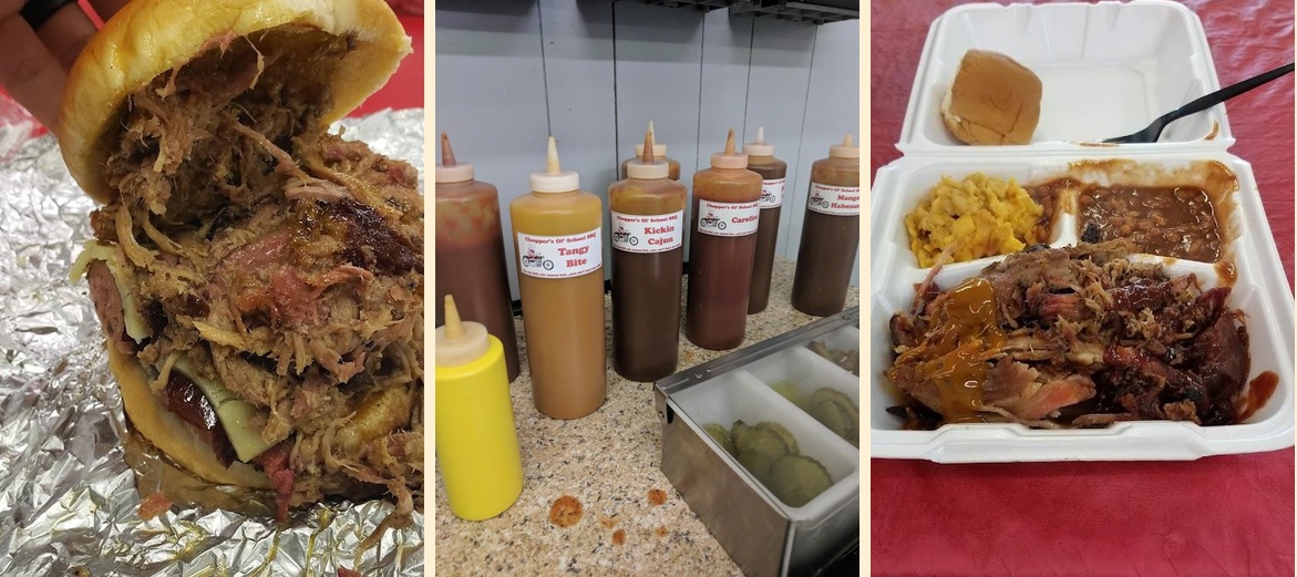 Visiting Chopper's Ol' School BBQ is a must for BBQ lovers. Their brisket, smoked to perfection, is legendary. Customers rave about the 'Betsy Sue' sandwich. This dish combines sausage, pork, and brisket topped with pepper jelly—a true delight!